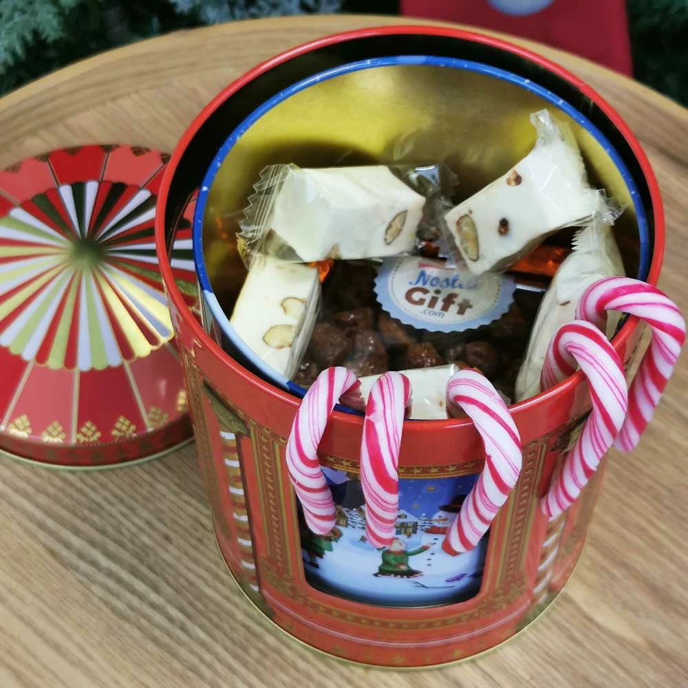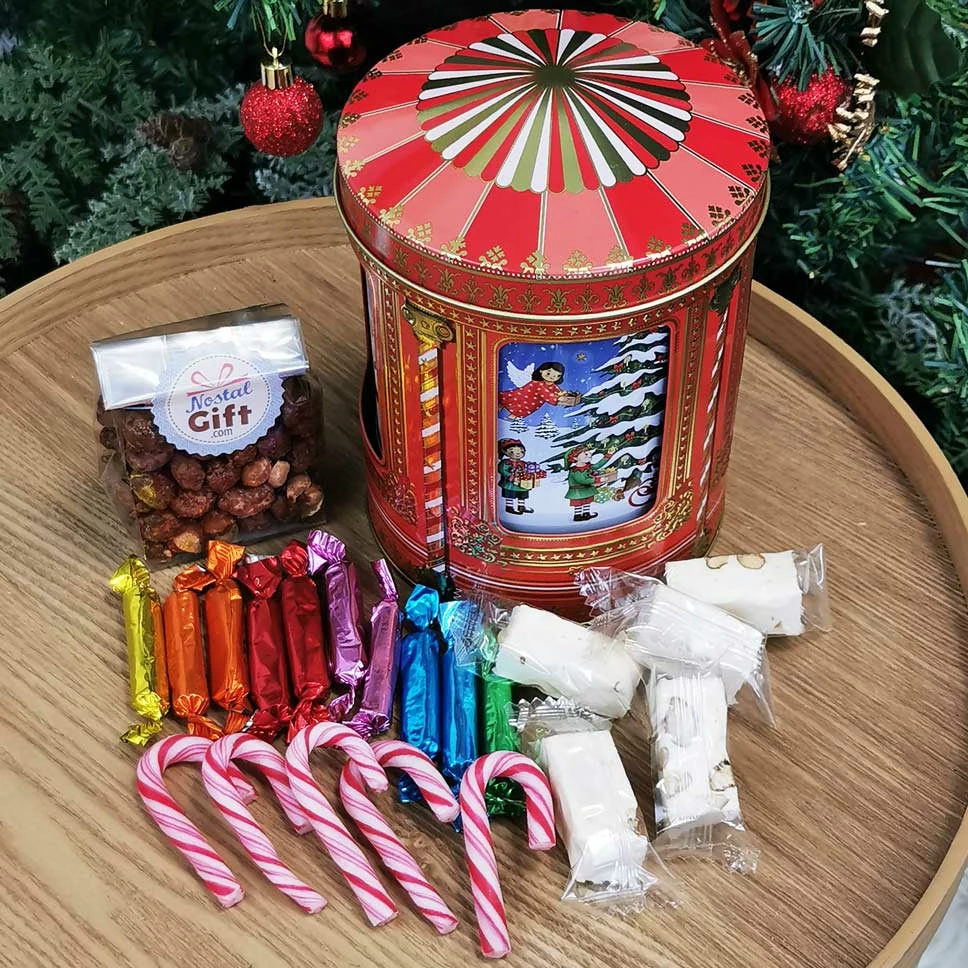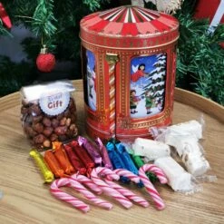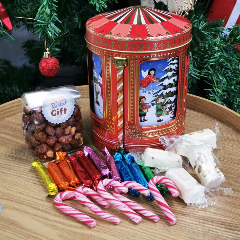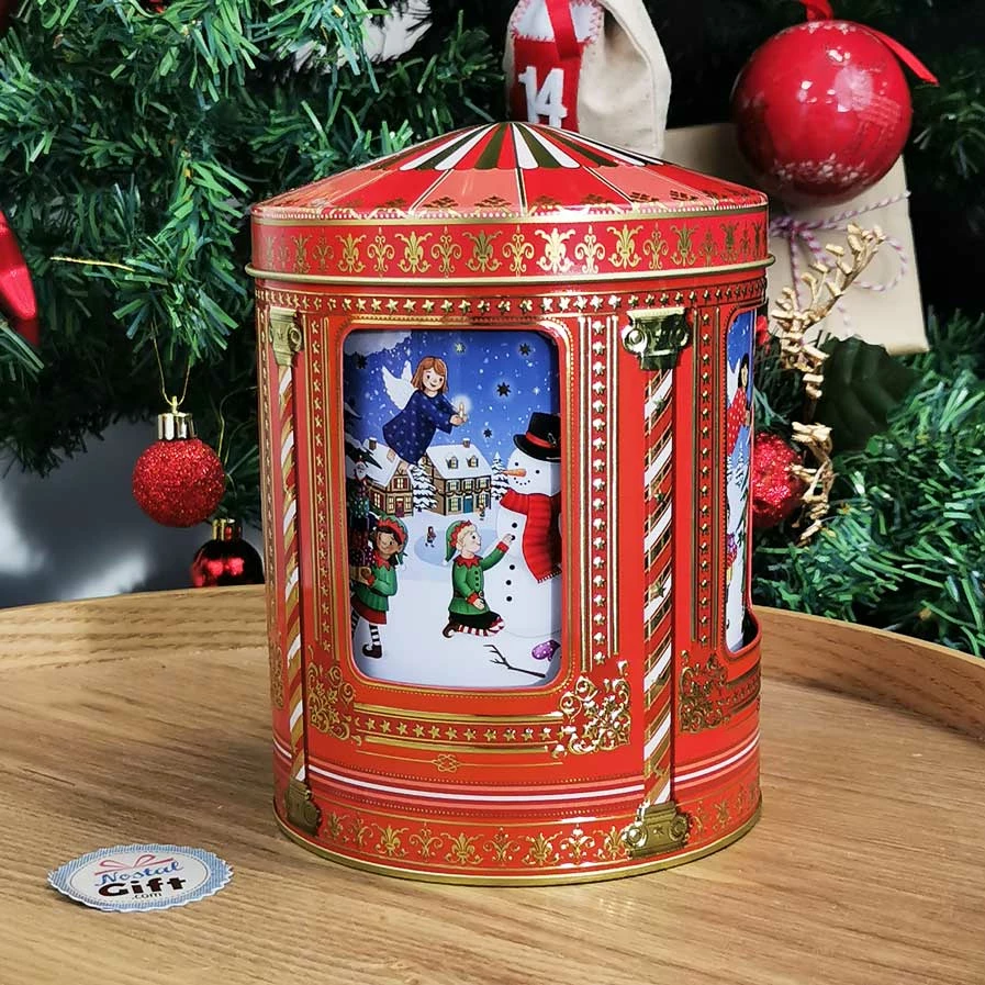Le coffret cadeau Carrousel chantant de Noël est livré dans une jolie boîte souvenir en métal au design de Noêl sous la neige. Elle contient :