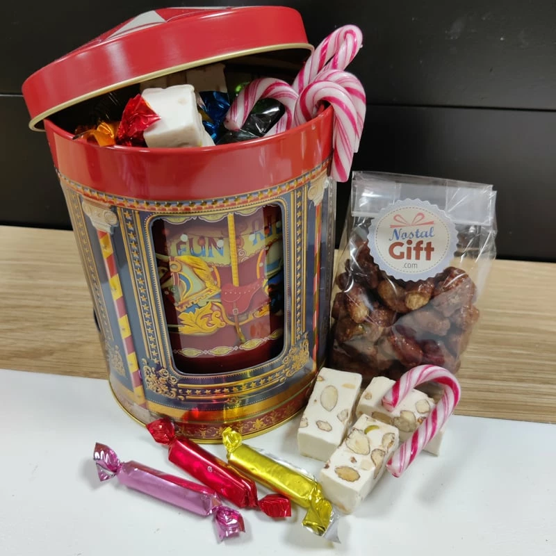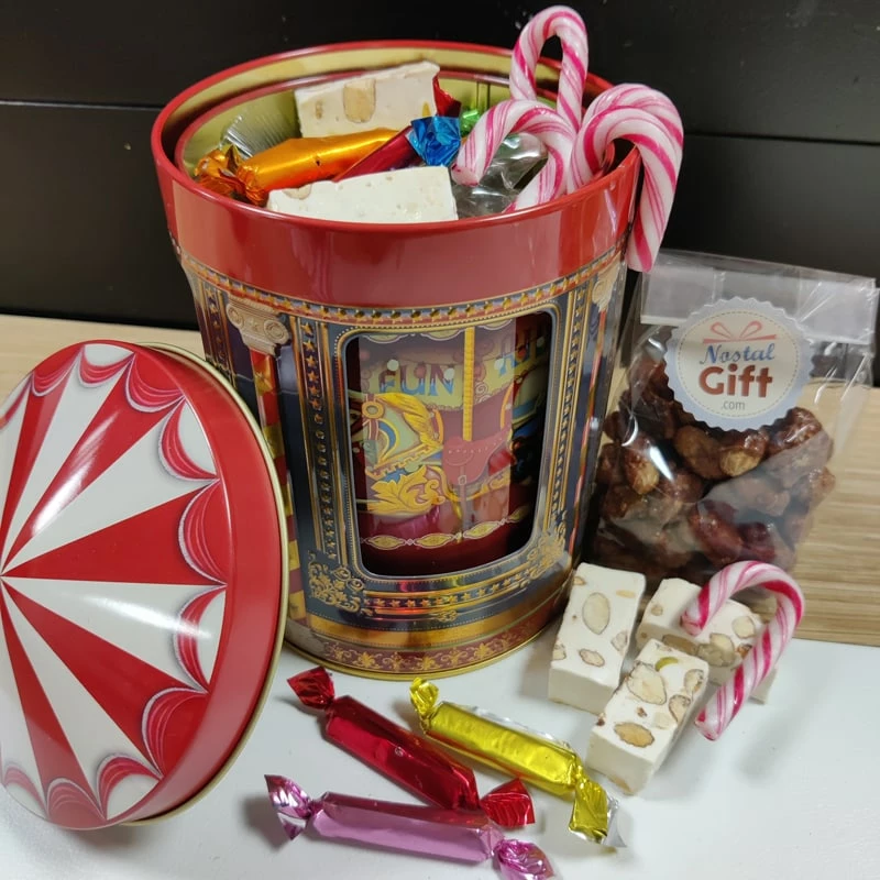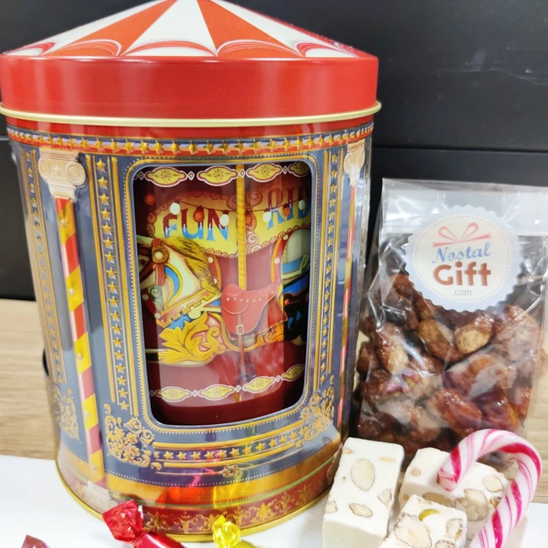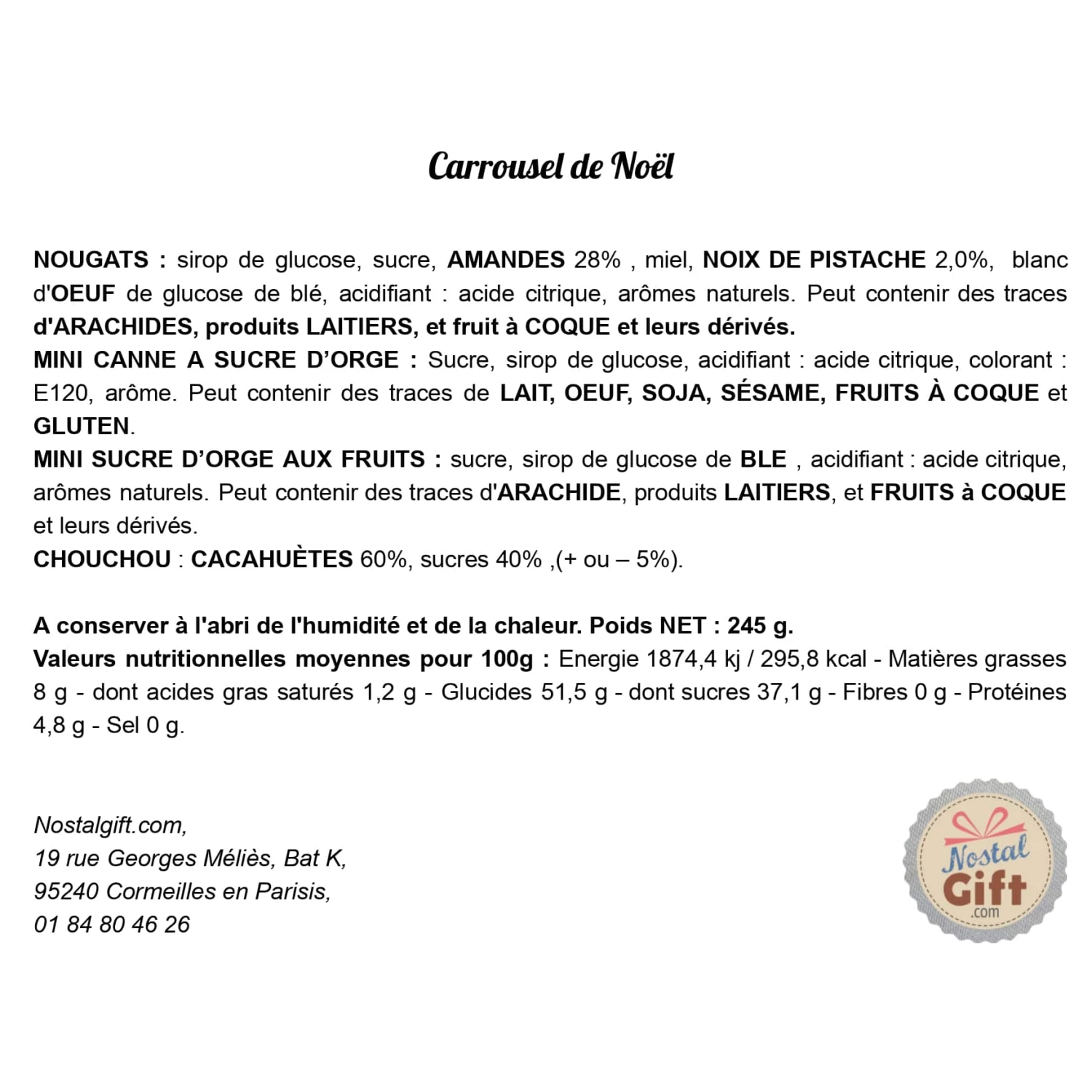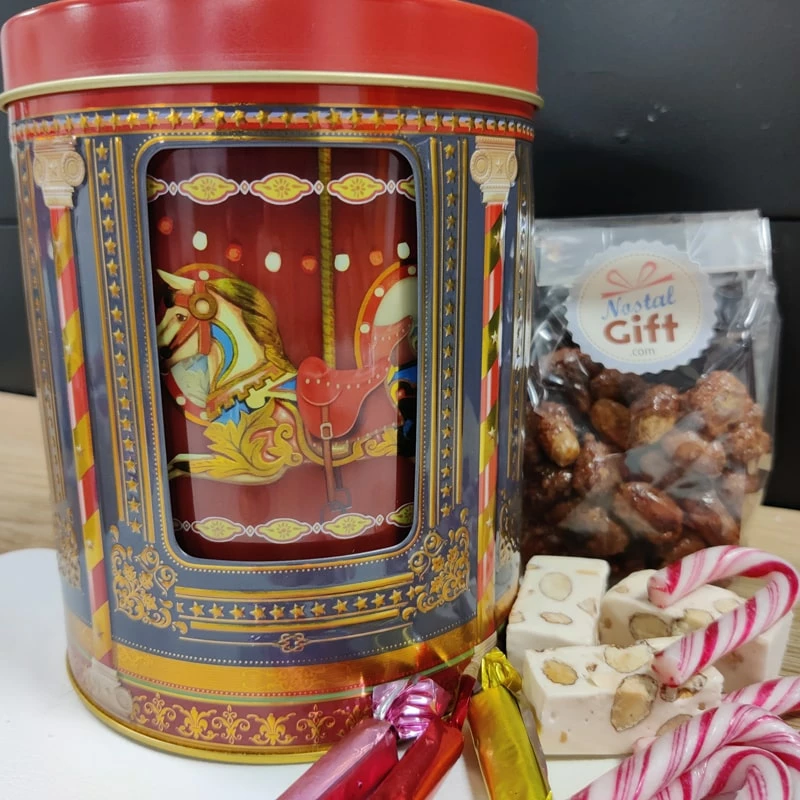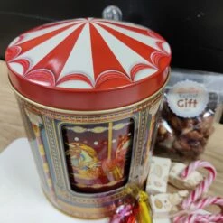 Le coffret cadeau Carrousel chantant de Noël est livré dans une jolie boîte souvenir en métal au design des années 60. Elle contient :