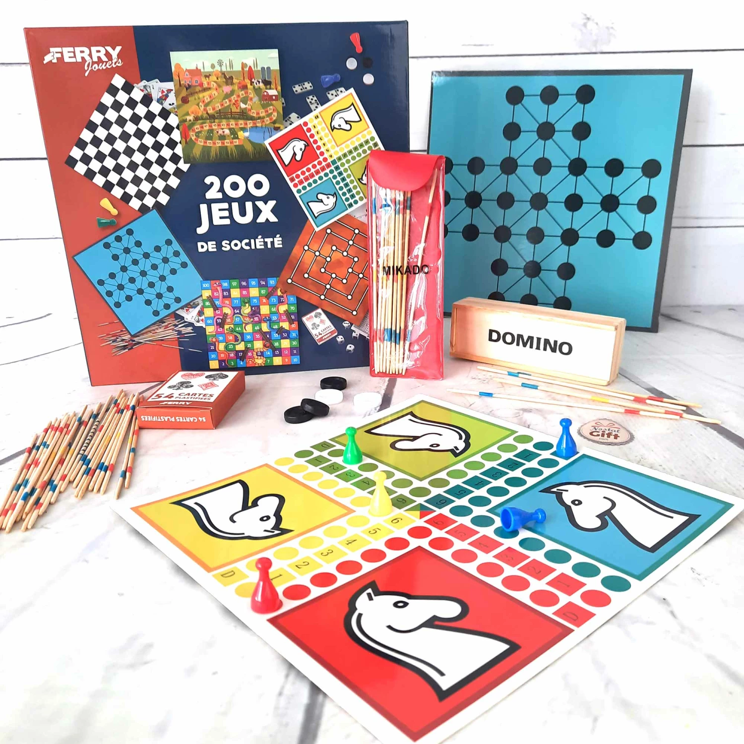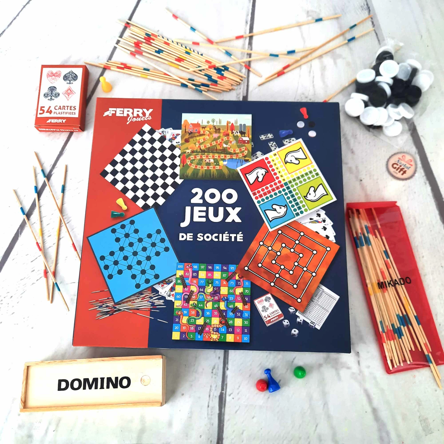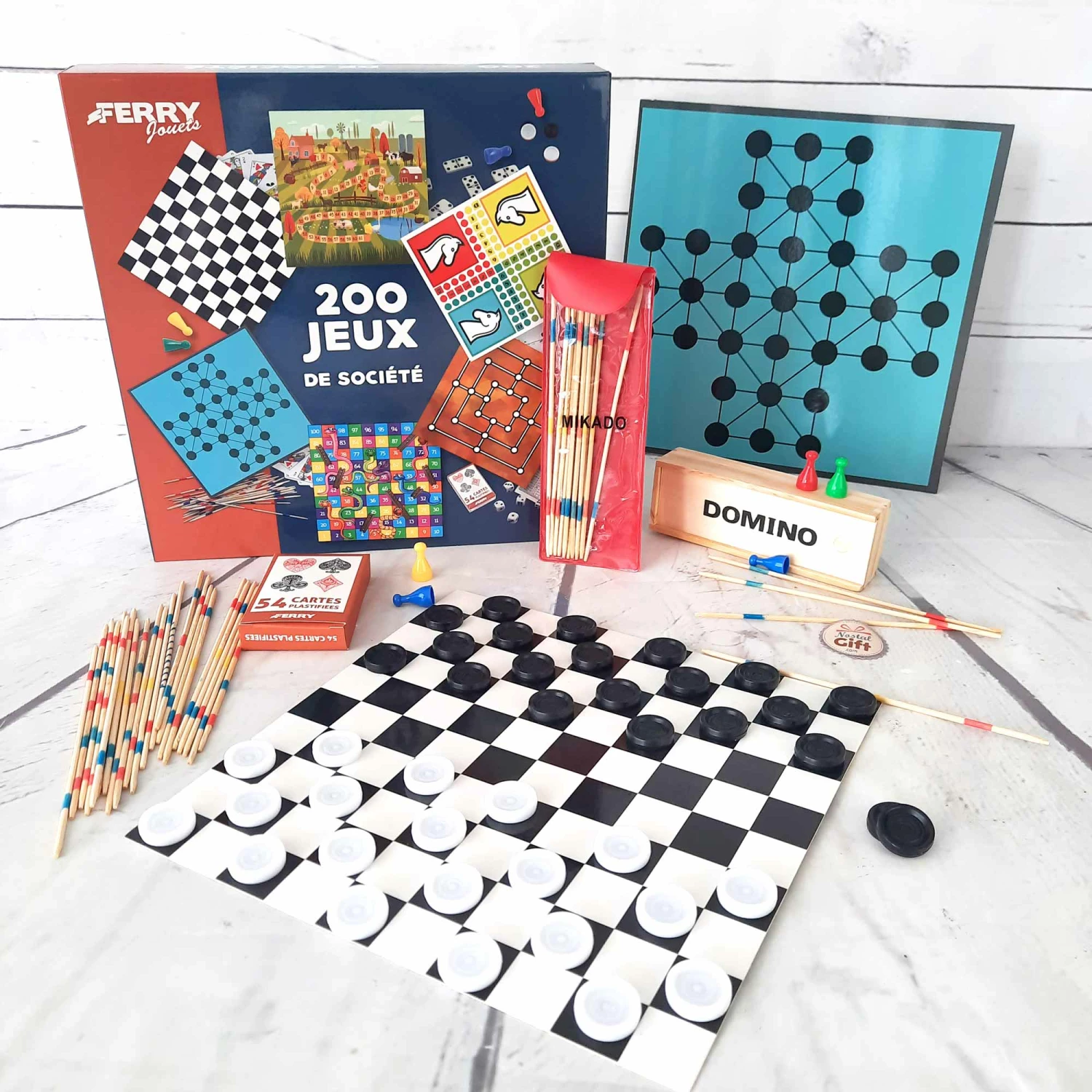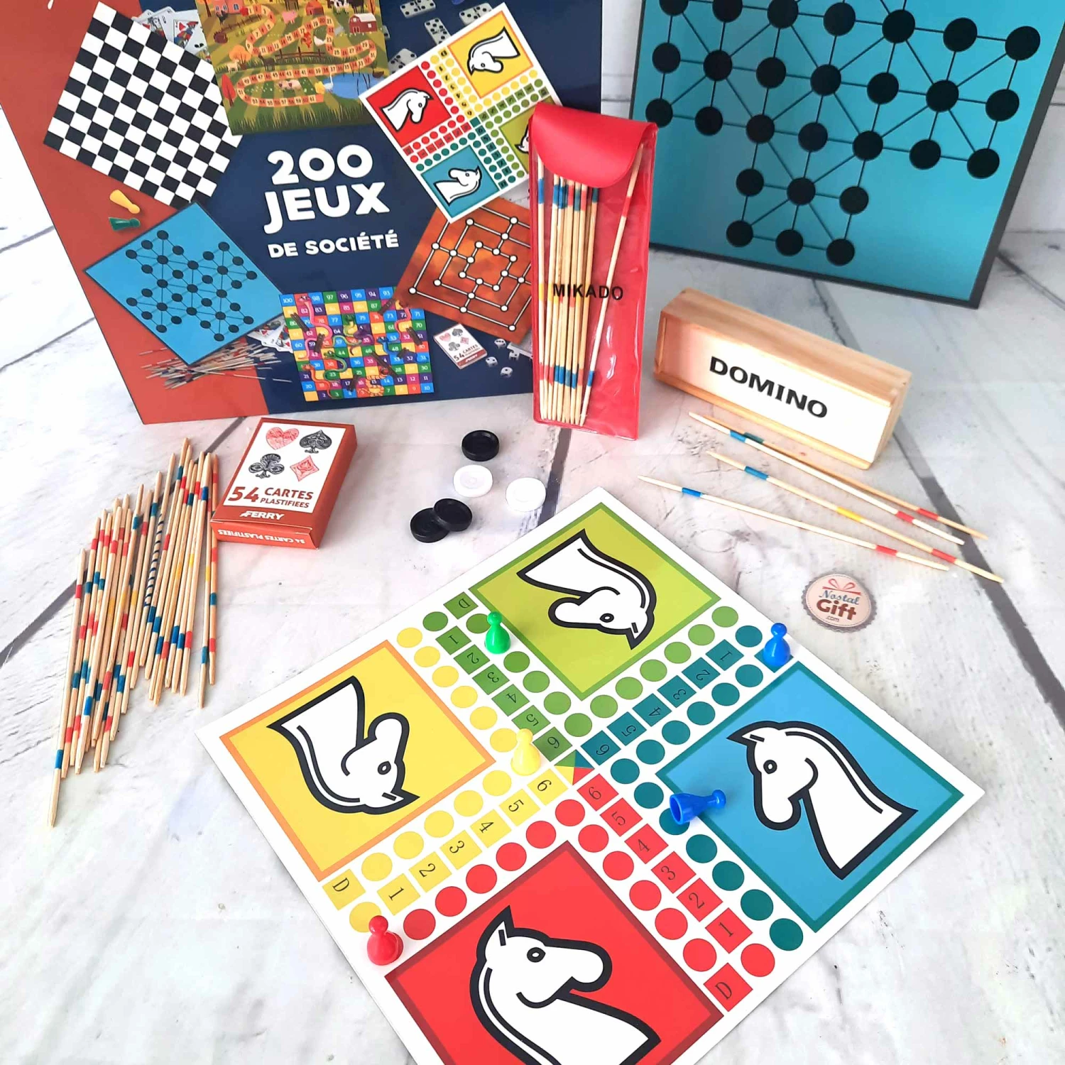 – Coffret contenant 200 jeux de sociétés classiques : Mikado, Dames, Jeu de cartes, Domino et Jeux des petits chevaux …
