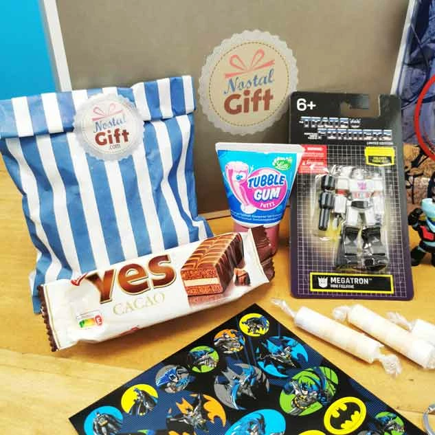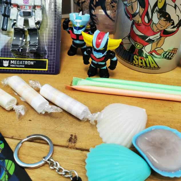 8 – Un sachet de bonbons avec : 3 roudoudous , 2 fruit à la poudre acidulée, 1 chewing-gum en tube “tubble gum” et 3 Fizzy roll