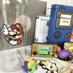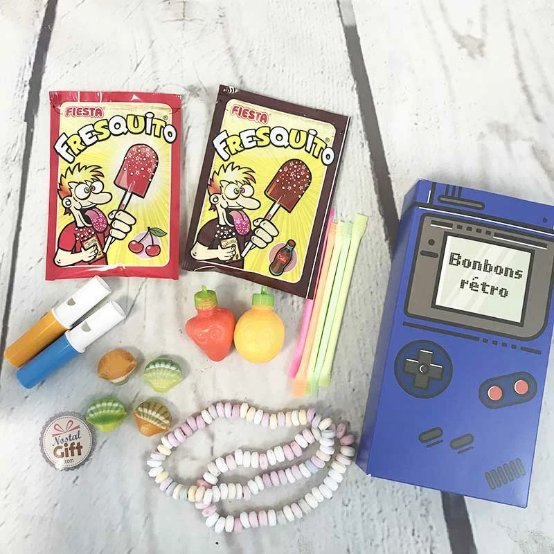 – Une boîte inspiration GameBoy de bonbons rétros en poudre avec : 1 Fresquito cola et 1 Fresquito cerise, 5 pailles acidulées, 2 fruits à la poudre, 2 colliers dextrose, 2 sifflets dextrose, 4 Cok’poudre.