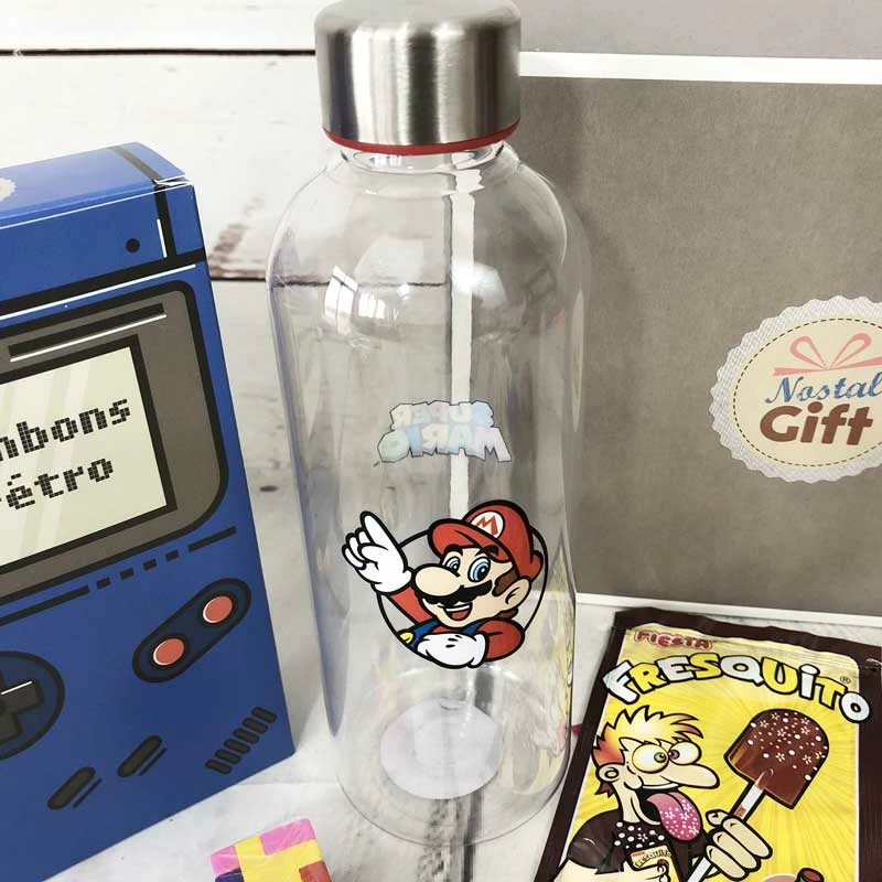 – Un gourde Mario de 850ml en plastique avec son bouchon en métal (sous licence officielle) de 22 cm
