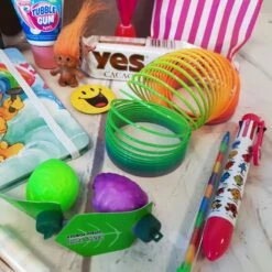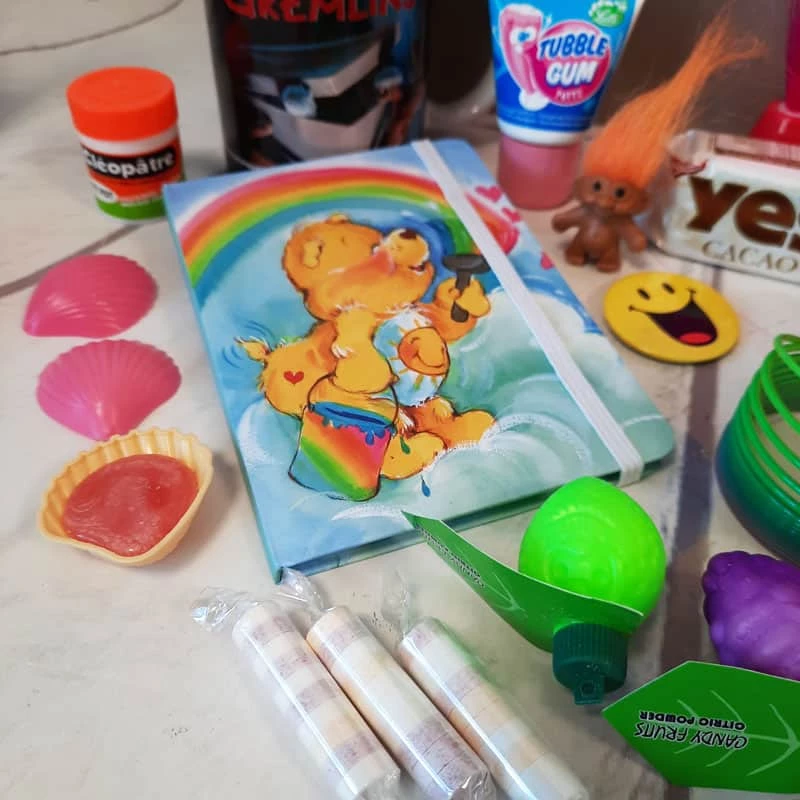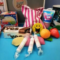 10 – Un sachet de bonbons avec : 2 roudoudous , 1 fruit à la poudre acidulée, 1 chewing-gum en tube “tubble gum” et 3 Fizzy roll et un gâteau Yes
