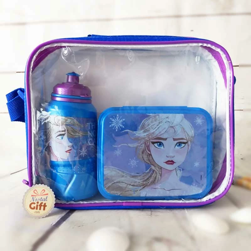 â Contient : un sac en bandouliĂšre ( 27 x 25,5) au visage dâElsa, une boĂźte Ă goĂ»ter ( 11 x 14) et une gourde en plastique ( hauteur 14cm)