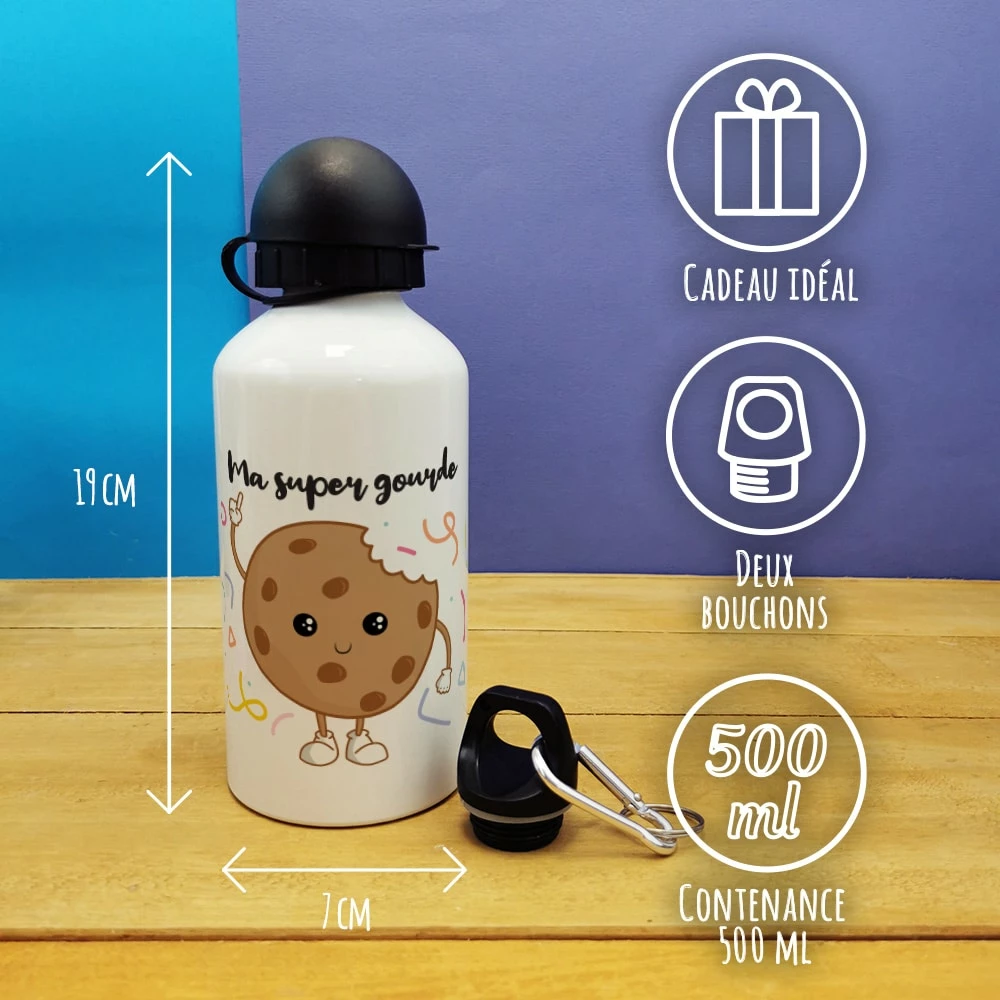 Gourde enfant Cookie – Cadeau pour fille, garçon, parfait pour la rentrée scolaire – 2 bouchons dont bouchon mousqueton