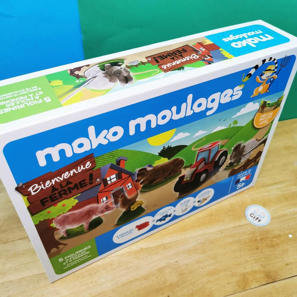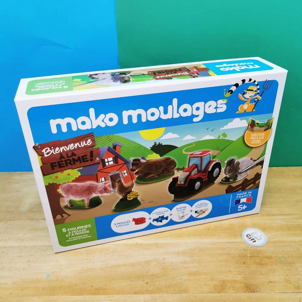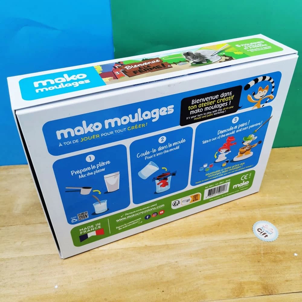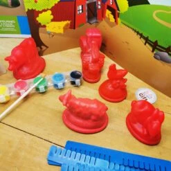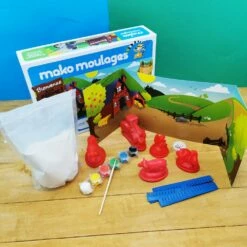â Le coffret contient : 5 moules en latex, 5 mini pots de peinture, 1 sachet de plĂątre refermable zippĂ© de 800g, 1 pinceau, 8 croisillons et un dĂ©cor de jeu « ferme ».