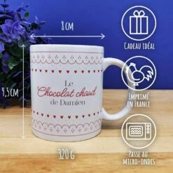 Offrez un cadeau de Noël original pour mamie ou cadeau de Noël au joli design pour maman ou cadeau de Noël au joli design pour belle mere pour Noël de votre mamie ou votre maman avec notre tasse, il sera parfait pour Noël. Sur ce mug, il est écrit ” Le chocolat chaud “sur l’avant et l’arrière de la tasse. Avec sa contenance de 320ml, cette tasse est idéale pour une pause café ou un chocolat chaud lors de ses moments de détente.