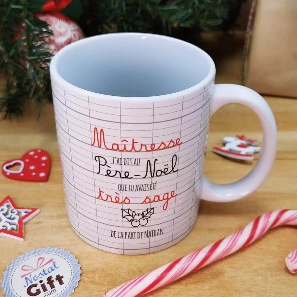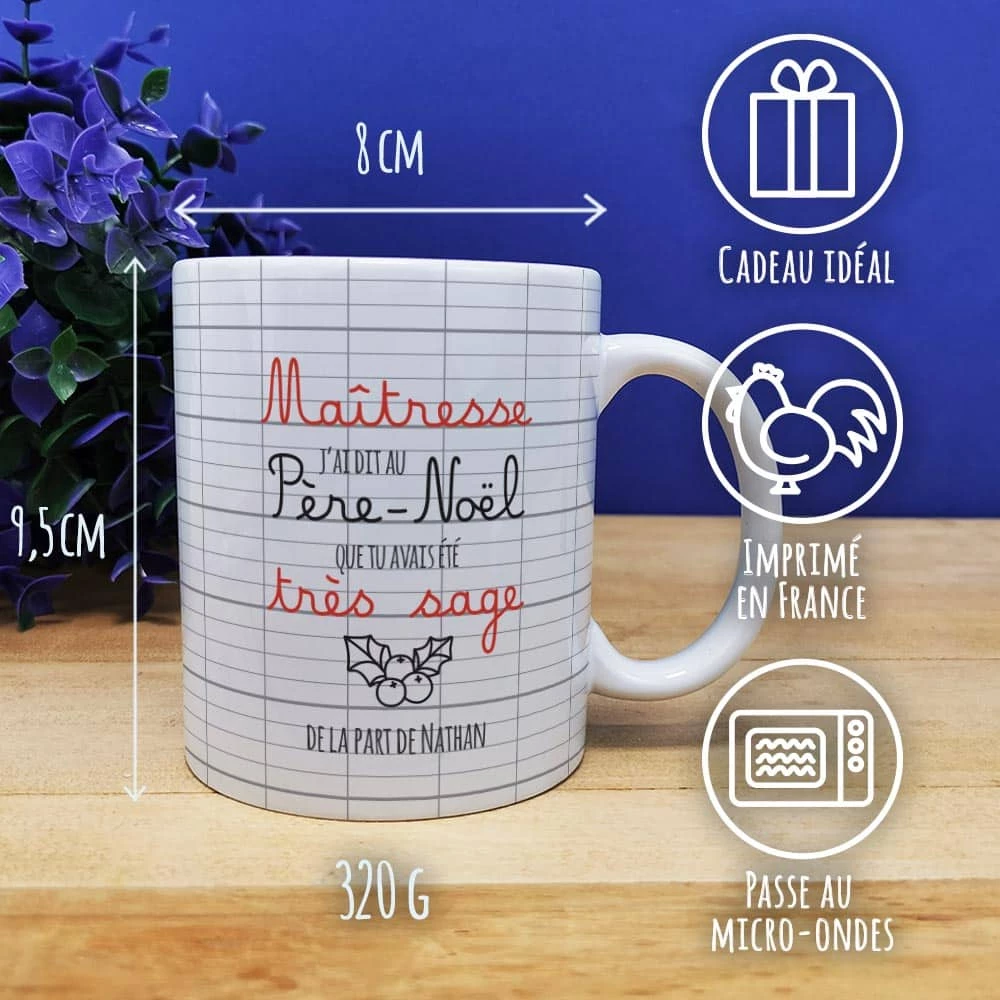 Offrez un cadeau de Noël qui dure pour la maitresse ou cadeau de Noël qui fait plaisirpour une directrice pour Noël de la maîtresse ou la directrice avec notre tasse, il sera parfait pour Noël. Sur ce mug, il est écrit ” Maîtresse j’ai dit au Père Noël que tu avais été très sage “sur l’avant et l’arrière de la tasse. Avec sa contenance de 320ml, cette tasse est idéale pour une pause café ou un chocolat chaud lors de ses moments de détente.