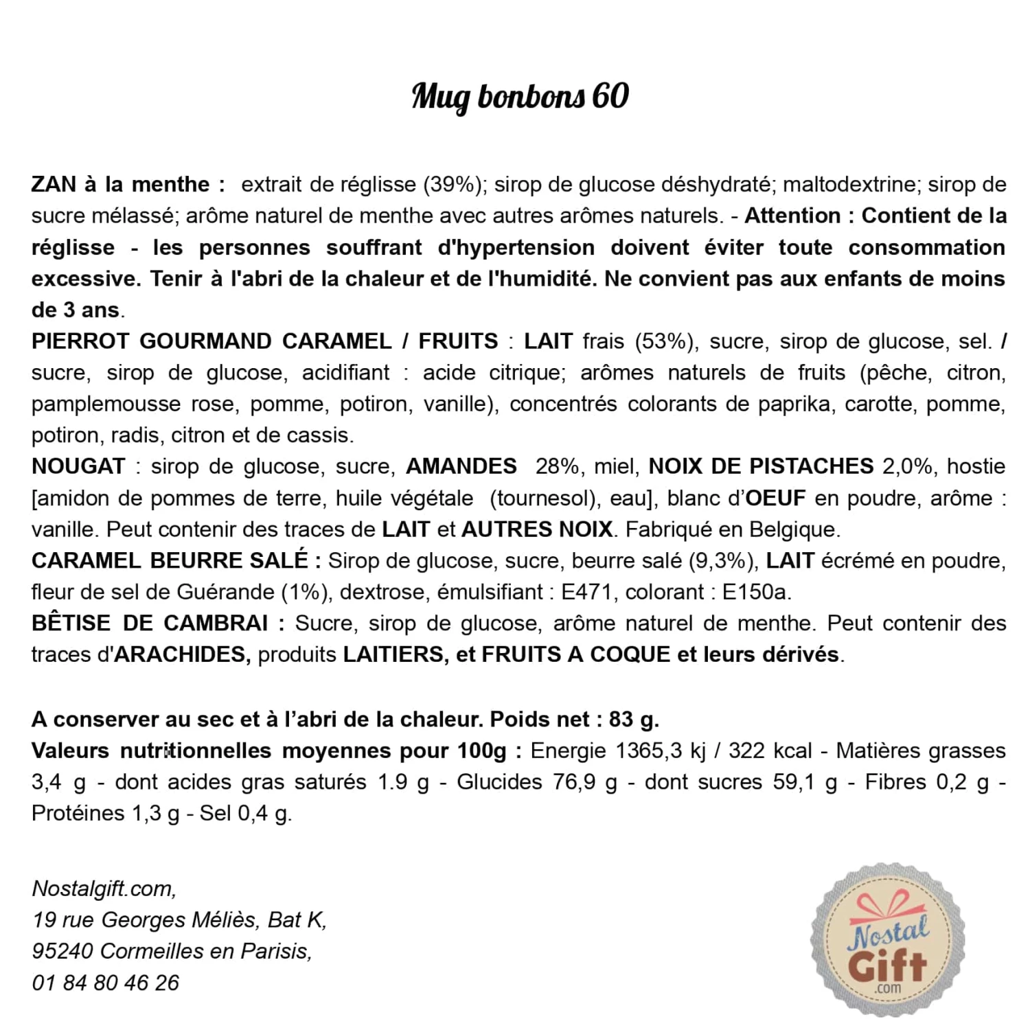 – Contient : 2 sucettes Pierrot Gourmand (gout aléatoire), 1 ZAN, 2 nougats tendres aux amandes, 2 caramels au beurre salé et 2 bêtises de Cambrai