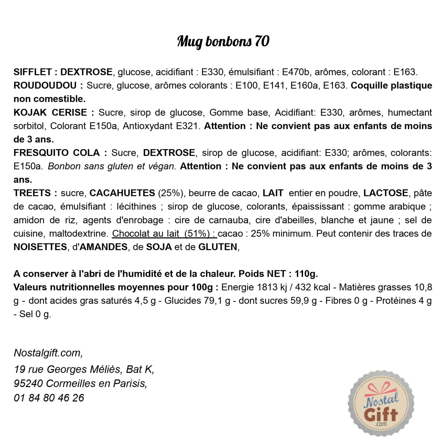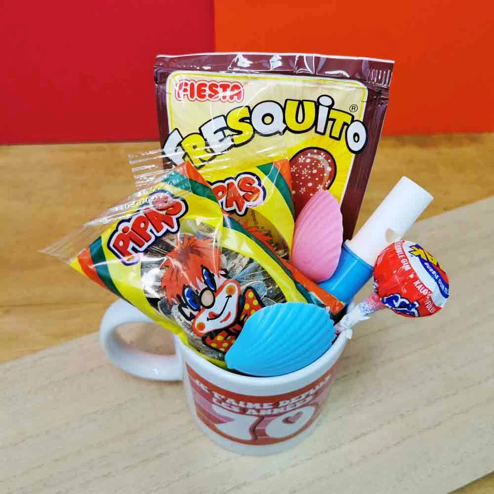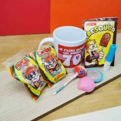 – Contient : 2 petit sachets de PIPAS, 1 Fresquito Cola, 1 bonbon sifflet dextrose, 1 sucette Kojak à la cerise et 2 roudoudous