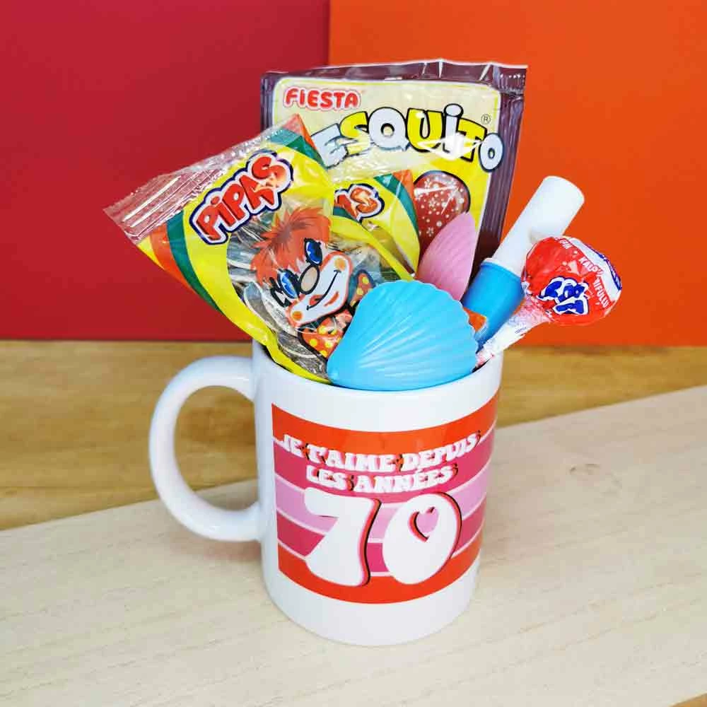 MUG rose “Je t’aime depuis les années 70 ” – Bonbons rétro 70