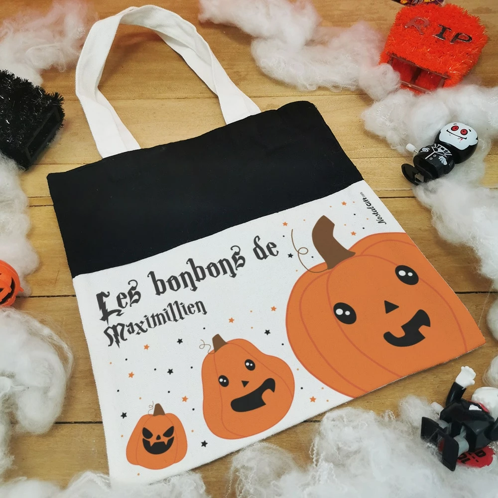 La chasse aux bonbons pour Halloween va bientôt commencer ! Votre enfant sera bien équipé avec ce très joli sac personnalisé aux couleurs des citrouilles gentiment effrayantes. N’hésitez pas à consulter nos bonbons Halloween pour remplir ce sac de douceurs !