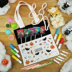 La chasse aux bonbons pour Halloween ne pourrait se passer de ce sac personnalisé au prénom de votre enfant ! Votre enfant sera bien équipé avec ce très joli sac au design de citrouilles, chauve souris, bonbons, fantômes…et en plus il sera ravi de déguster nos meilleurs confiseries (Collier, roudoudou, sucette, sifflet, guimauve…). N’hésitez pas à consulter nos bonbons Halloween pour compléter ce sac de douceurs !