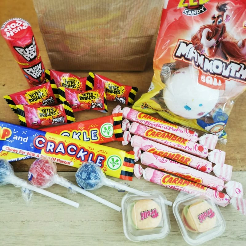 Le sachet contient :- 5 têtes brûlées (gout aléatoire)- 1 push pop (gout aléatoire)- 3 sucettes tâche langue- 1 couille de mamouth- 2 mini Burger- 2 snap crackles- 5 carambar atomic 5 carambar barbe à papa