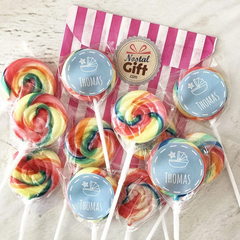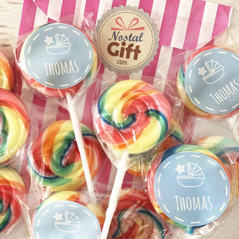 Sucettes rondes foraines personnalisées x12 – Berceau (Garçon)
