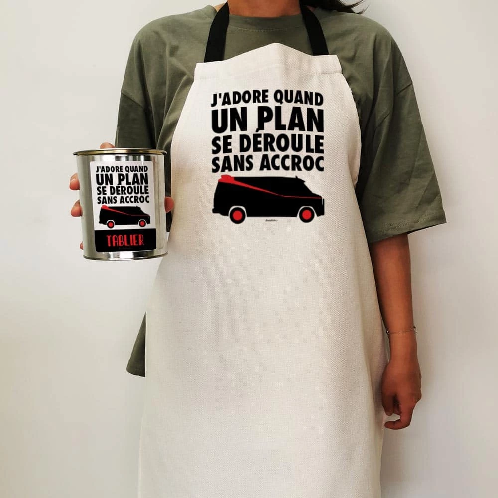 Ce tablier est livré dans un boite de conserve hermétique, ce qui en fait un cadeau très original.