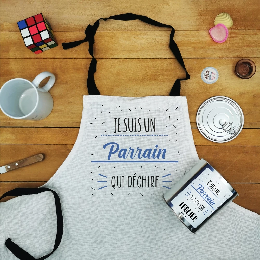 Tablier de cuisine dans sa boîte de conserve – “Je suis un parrain qui déchire” – Cadeau Parrain