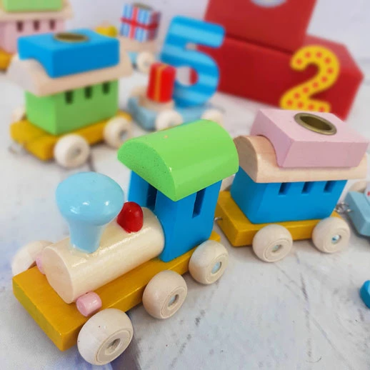 – Contient : un train de bois avec 7 wagons et 6 chiffres
